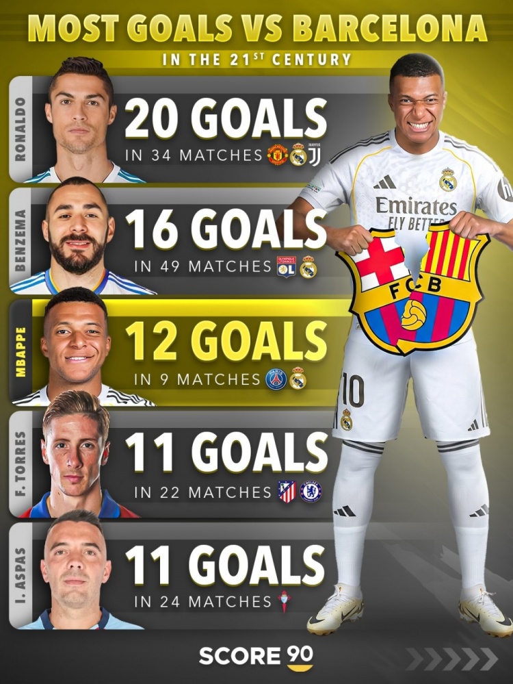 本世纪对阵巴萨进球榜:C罗20球居首,本泽马、姆巴佩前三
