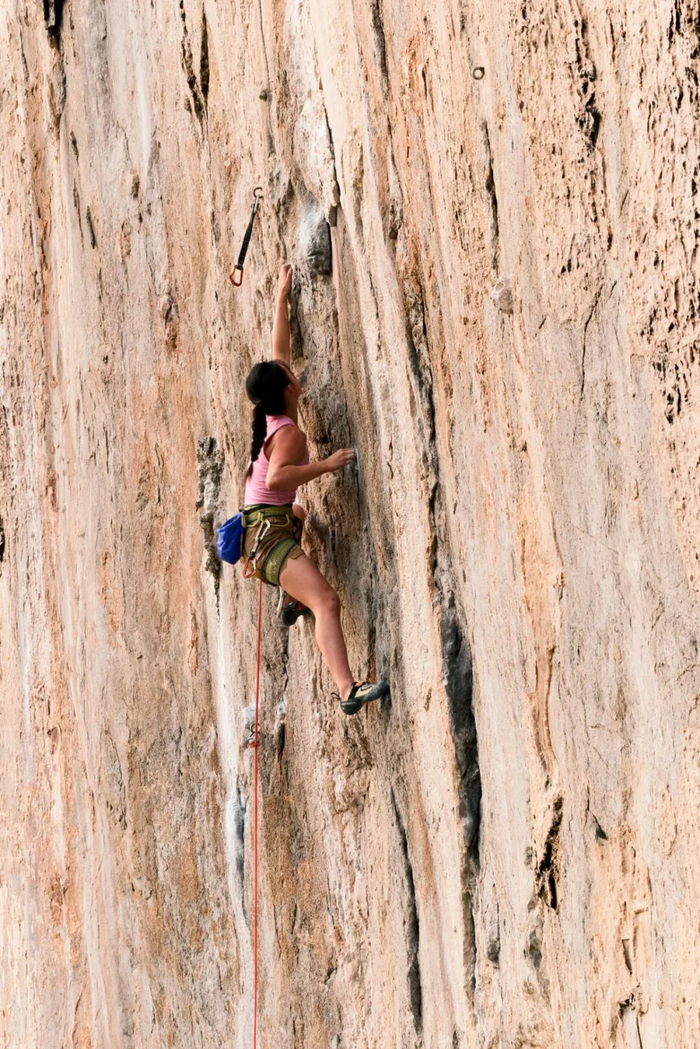 十六岁的攀岩运动员李美妮则展现了“心流”的另一种形态。生活中她充满好奇心,一旦穿上攀岩鞋,瞬间进入锐利专注的状态。从五岁在甲米掉下第一颗乳牙的童年记忆,到十六岁重返此地挑战5.14难度线路,她在难点反复冲坠、崩溃落泪,又在情绪宣泄后重新聚焦。她说,“不去想下一步难不难,身体自己会找到节奏。”